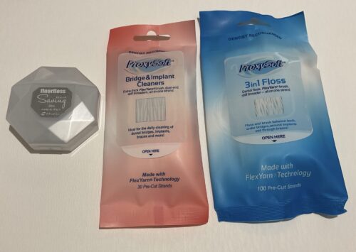 プロキシソフト3in1Floss、こちらはスレッダー、フィラメント、フロスの3つの役割を1つにまとめたフロスです。インプラントや少し狭いブリッジ下、矯正中のワイヤーの下などに使用出来ます。