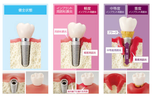 インプラント周囲の歯茎のみに問題が起こることで、赤くなったり、腫れたり血が出てきたりする症状を言います。